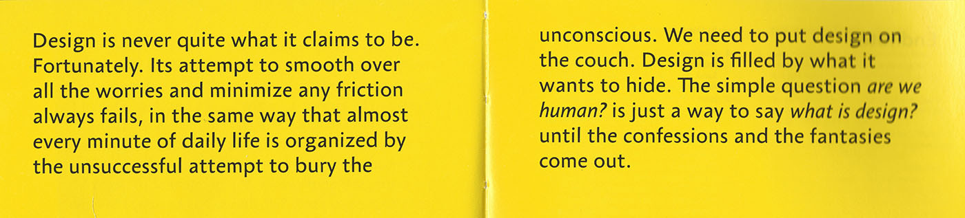 In addition to the interesting content of the book, repositioning design, a special thank you has to go to the design of the book itself. It is a beautifully designed object that is a pleasure to use. It is small, and easy to grab. The cover doesn’t boast, so it is clearly not an “airport-book”. However, the interior design makes up for the discreet cover. Each chapter is well illustrated and well researched (notes are available at the end of the book, so they don’t obstruct your reading unless you are interested in them). Between the actual chapters there are pictures with quotes from a broad array of thinkers, as well as “yellow pages” with provocative thoughts and concluding remarks on each section. The book itself is a great example of human design.
