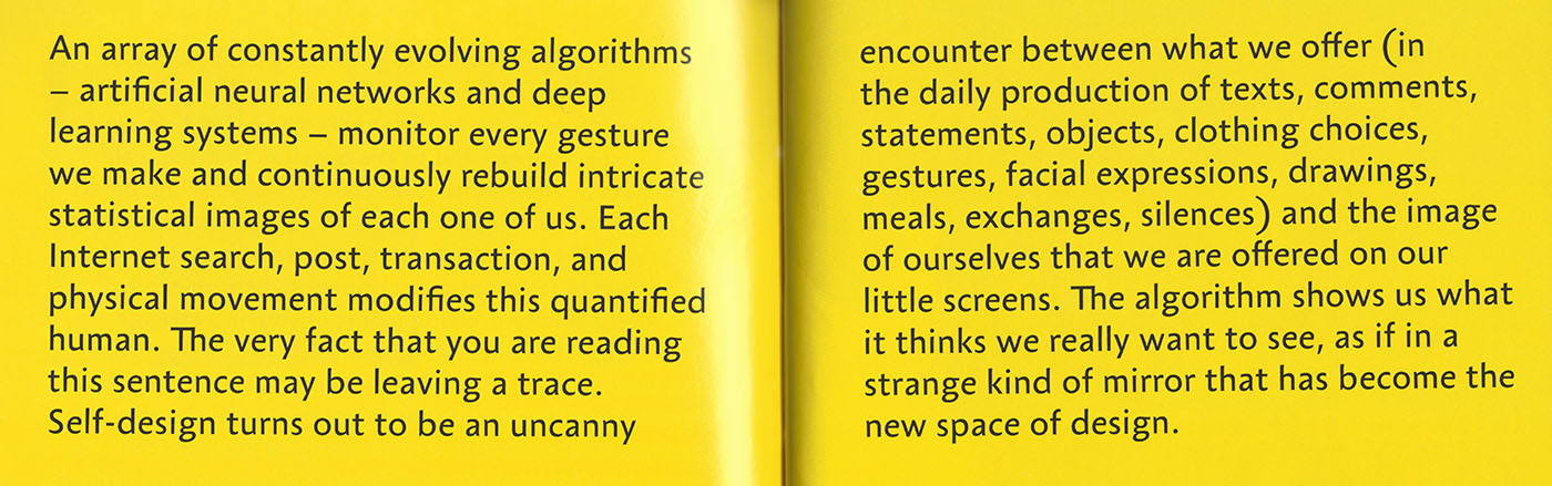 The awareness of all the surveillance that these broad amounts of data make possible and the suttle weariness thereof is not the only critical stance the authors of this book pose. They also question the notion of design itself, and ask us when we just use design, defined as “good” design, as an anesthetic – to cover up for the real world. Design has become the uncritical celebration of progress, and the ability to modernize one self. “Good design” has become a morally infused way of making decisions about objects that galvanize government, business, industry, class, and art interests.