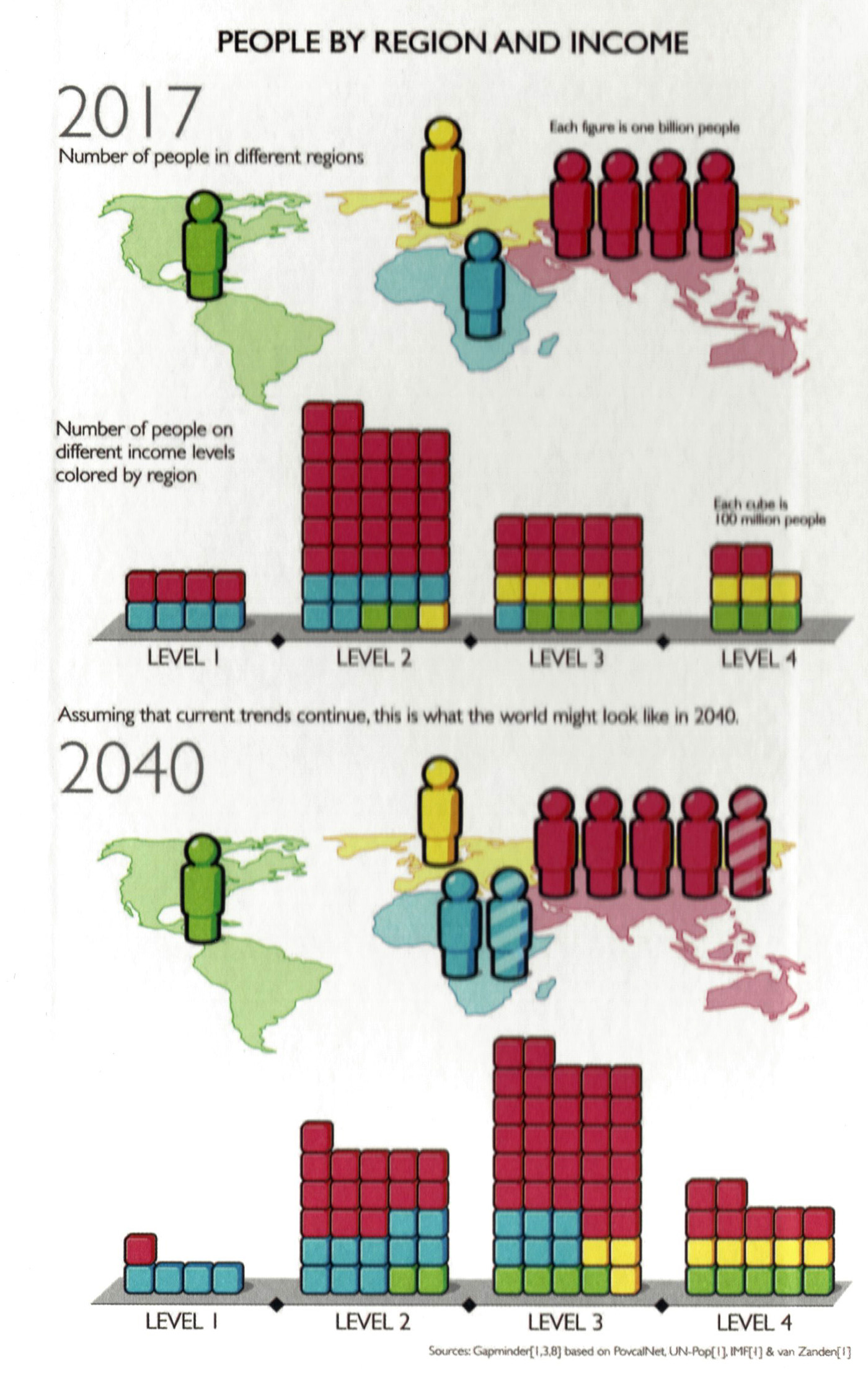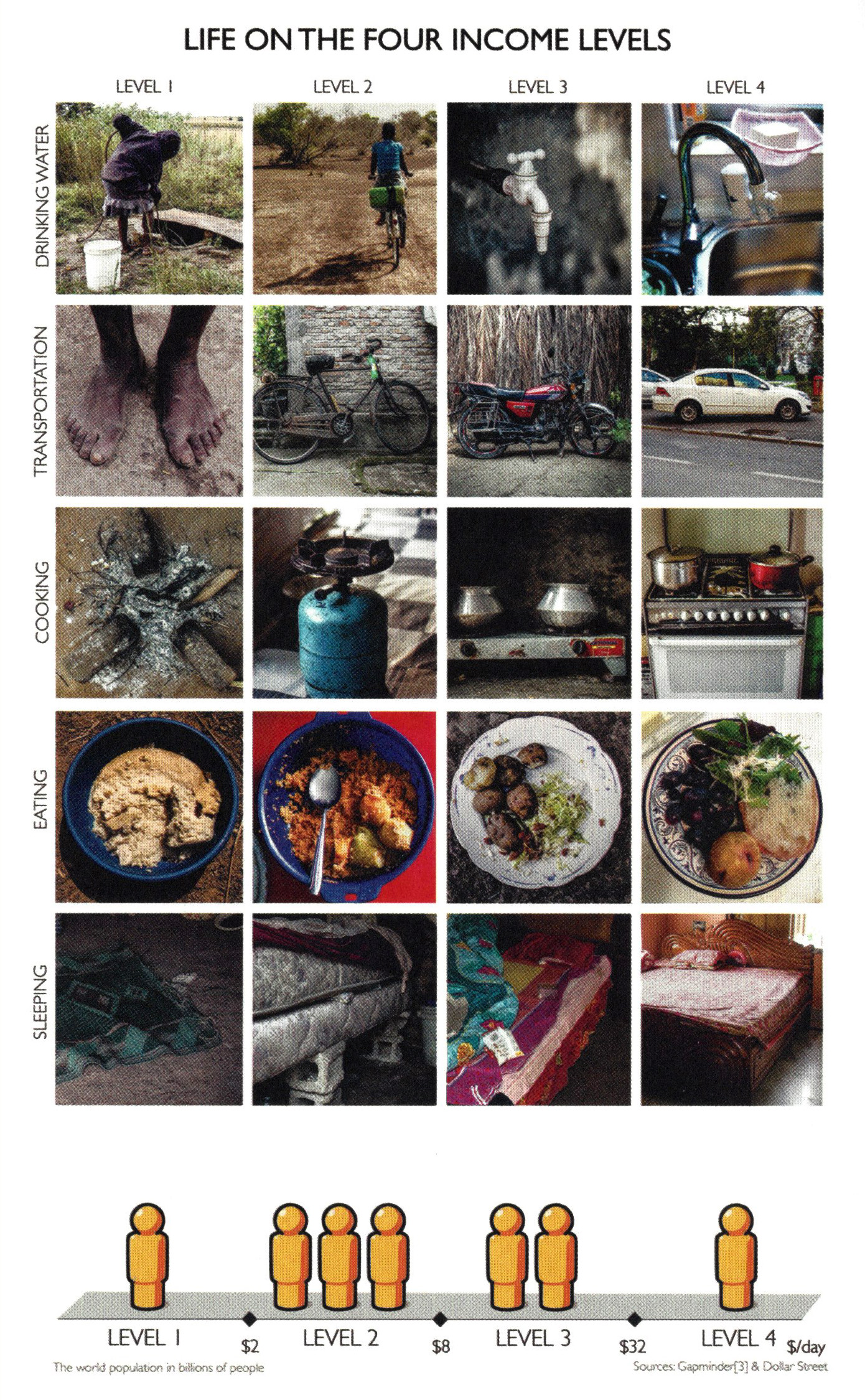 Many of the big picture overviews are sort of bubble graphs, showing distribution through colour, size and position of these “bubbles”. The animated bubble graph is a result of a software called Trendalyzer, which was acquired by Google in 2007. In addition, there are great photographs, showing in a very simple way how some of our daily commodities are different (and similar) depending on our income level. On level 1 the most common form of transport is to walk by foot, on level 2 we can afford a bike, on level 3 a motorcycle and 4 a car. More of these pictures are also available within the project called Dollar street on the www.gapminder.org-site. These kind of analyses of potential end-users or customers are also done within larger, consumer-oriented companies, but usually those companies do not share how they do it or the methodology behind the work, as it is considered very strategic and confidential. The Gapminder model is an excellent way to do this work, and can serve both as an inspiration and as a tool to many organisations. If we want to solve the world’s most pressing problems, we need to know what, for whom, and why we are trying to solve.